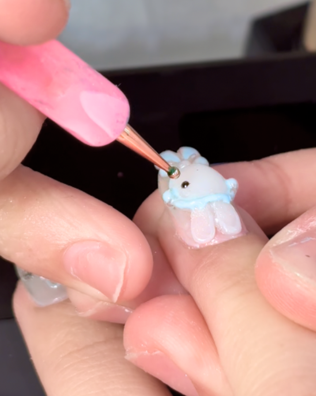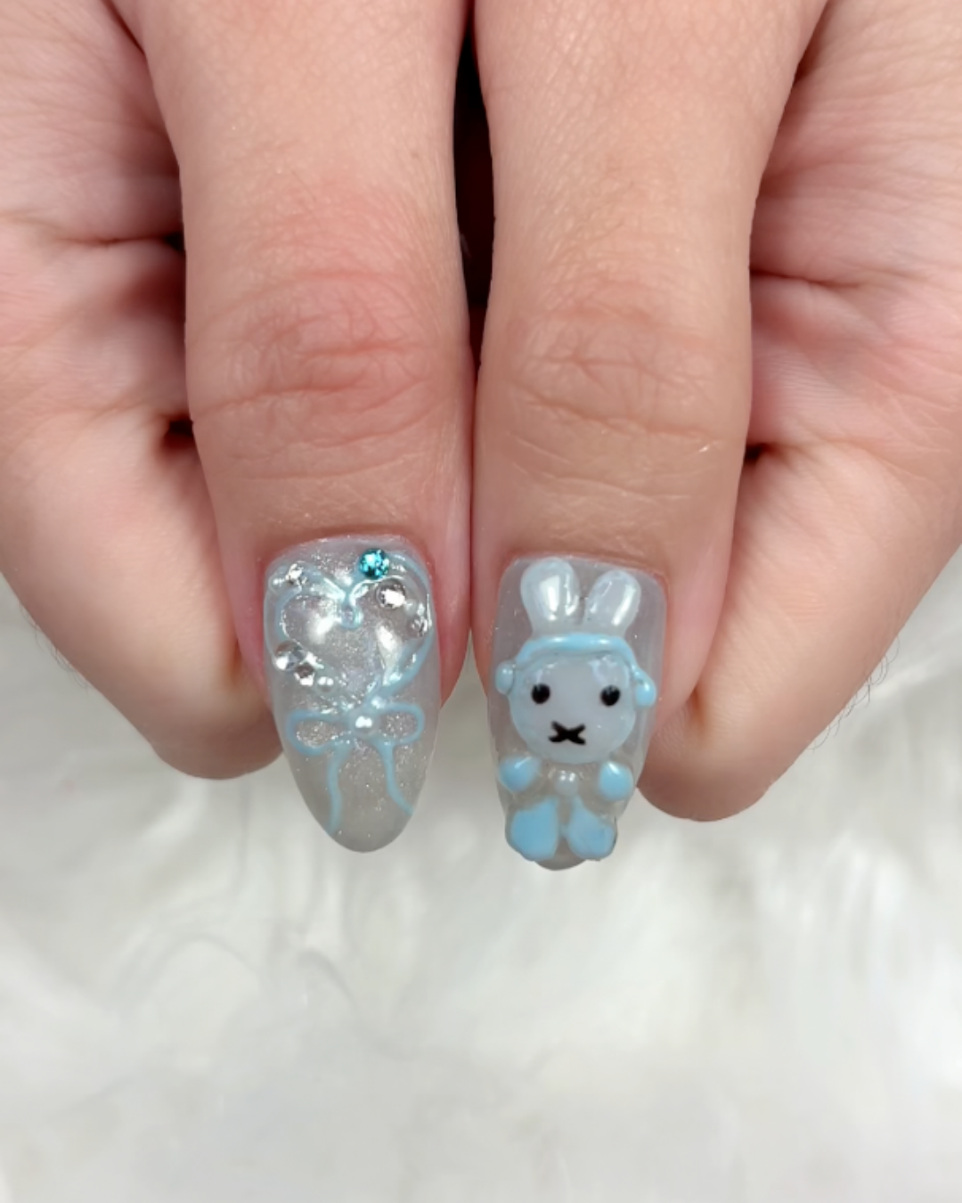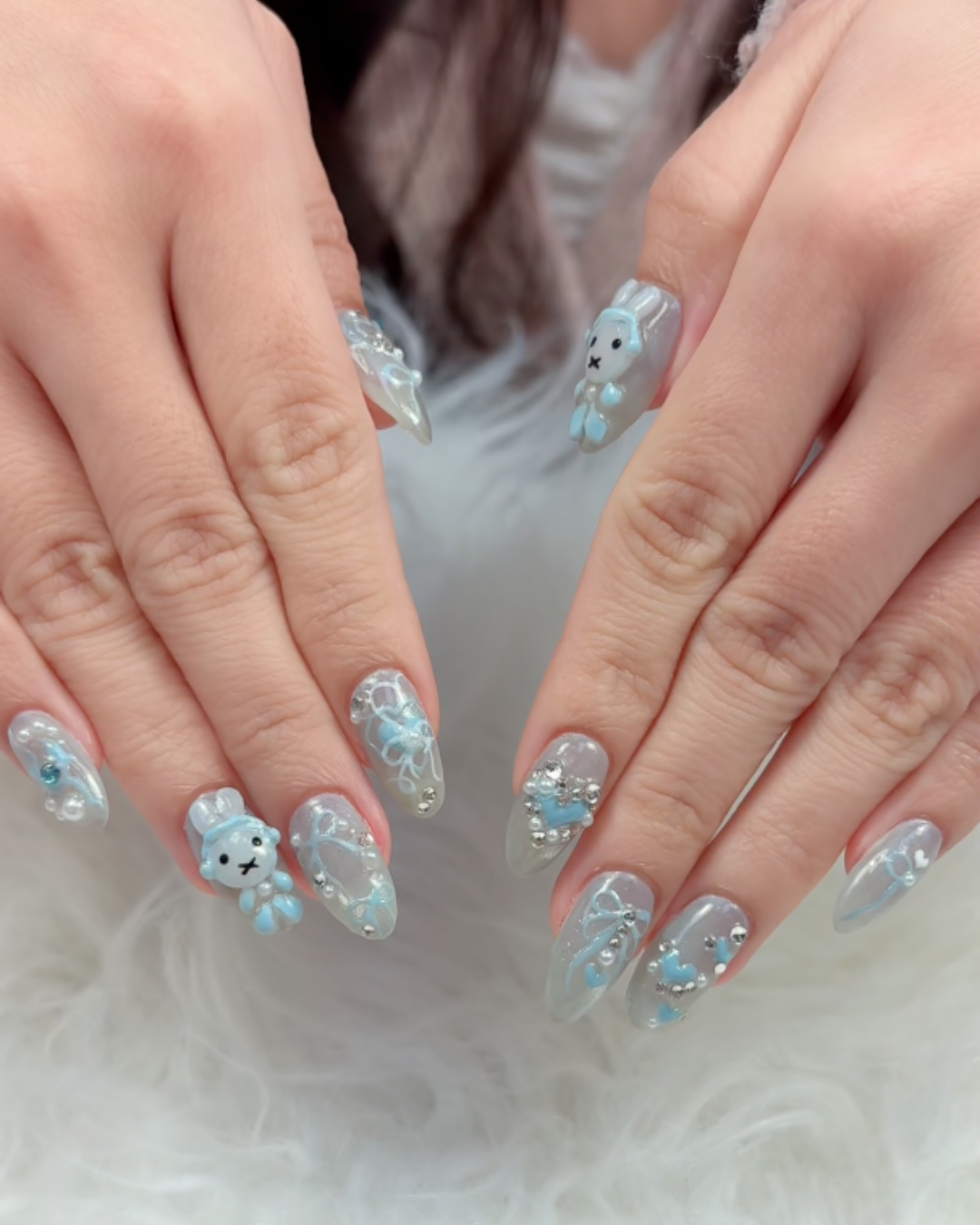 The design featured Miffy wearing powder blue earmuffs with a ribbon scarf, surrounded by coquette inspired details like bows and hearts. They also added pearls and small stones to enhance the overall look. I am not entirely sure of the exact nail art terms, but the embellishments added such a delicate, dreamy touch that made the design feel extra special.